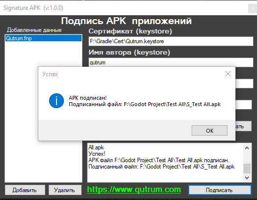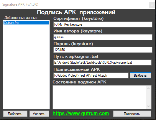 Теперь, нужно будет просто выбрать созданный вами в Godot файл apk и нажать кнопку "Подписать"